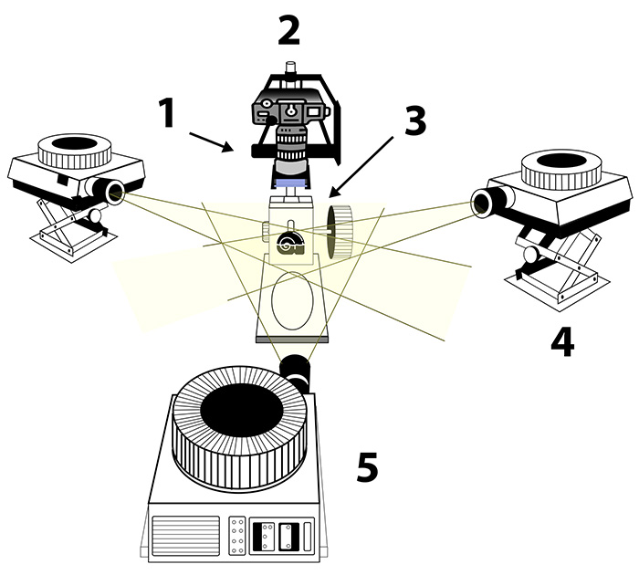 Equipment required to make SLP images is no longer commercially available. For those still wanting to try SLP, a working system can be built for approximately 50-100 dollars depending on how much equipment can be borrowed, rented or scavenged. The setup used to make the accompanying images consists of three standard Kodak EktagraphicTM AF-2 projectors using ELH lamps and fitted with 102-152mm zoom lenses. The projectors were positioned at a distance sufficient to project as thin a focused plane of light on the sample as possible, about 24 inches from lens to subject. To create the thin plane of light, plastic slide mounts were used to hold pieces of double edged razor blades, edge to edge, across the center of the slide mount aperture. The area above and below the metal of the blade was masked with at least two layers of metallized tape to limit the spill of light (Root, 1986). To adjust the height and level of the projectors we initially used books and cardboard shims. This is not a practical approach if you plan on doing SLP on a routine basis, but a good way to run film exposure tests to see if the rest of your setup works. Later, the purchase of equipment jacks from VWR scientific supply house provided quick and easy adjustments for height, pitch and roll [figure 2].